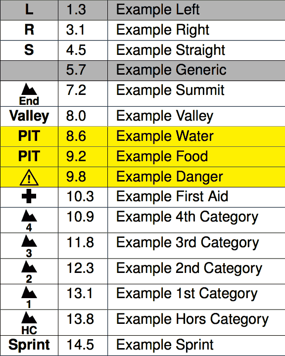 If the above types aren't sufficient, you can specify your own entry type by putting it in brackets at the start of the cuesheet entry. For example, to mark a U-Turn with a "U", just put "[U]" at the start of the entry: